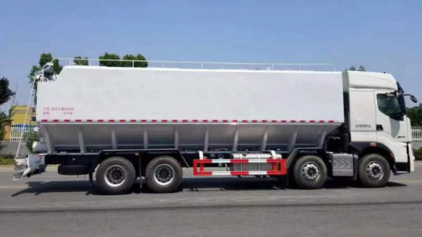 散裝飼料運(yùn)輸車,散裝飼料車的飼料罐架設(shè)在卡車的底盤上,罐頂開有進(jìn)料口.頂部的一根螺旋輸送卸料管(俗稱卸料絞龍)則可自由回轉(zhuǎn)和抬升,抬升的仰角可達(dá)60度。運(yùn)輸時(shí),頂部的螺旋管平臥在罐頂;卸料時(shí)則抬起,使管端的出料口與畜禽飼養(yǎng)場(chǎng)貯料罐頂部的進(jìn)料門相接,駕駛室內(nèi)裝有操縱裝置(操縱裝置也可裝置在罐體尾部),卸料時(shí)通過(guò)車底的動(dòng)力輸出軸和減速器來(lái)驅(qū)動(dòng)螺旋,以完成卸料。