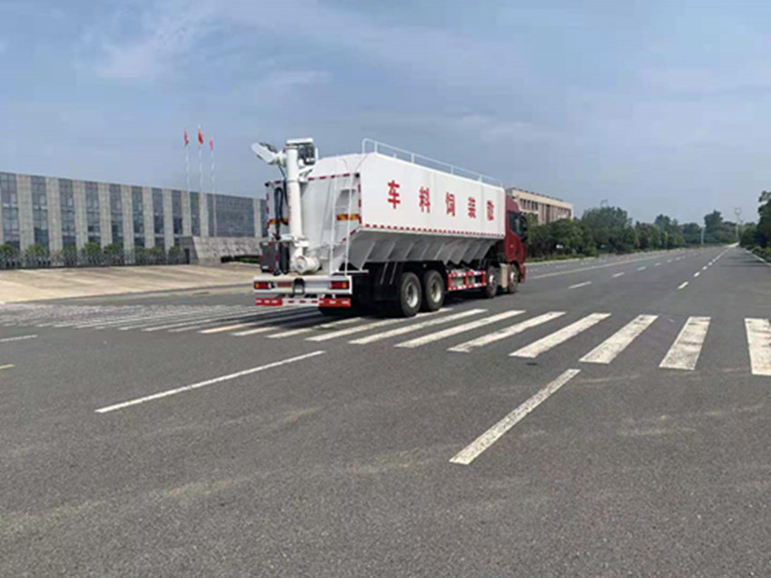 散裝飼料運輸車,散裝飼料車的飼料罐架設(shè)在卡車的底盤上,罐頂開有進料口.頂部的一根螺旋輸送卸料管(俗稱卸料絞龍)則可自由回轉(zhuǎn)和抬升,抬升的仰角可達60度。運輸時,頂部的螺旋管平臥在罐頂;卸料時則抬起,使管端的出料口與畜禽飼養(yǎng)場貯料罐頂部的進料門相接,駕駛室內(nèi)裝有操縱裝置(操縱裝置也可裝置在罐體尾部),卸料時通過車底的動力輸出軸和減速器來驅(qū)動螺旋,以完成卸料。